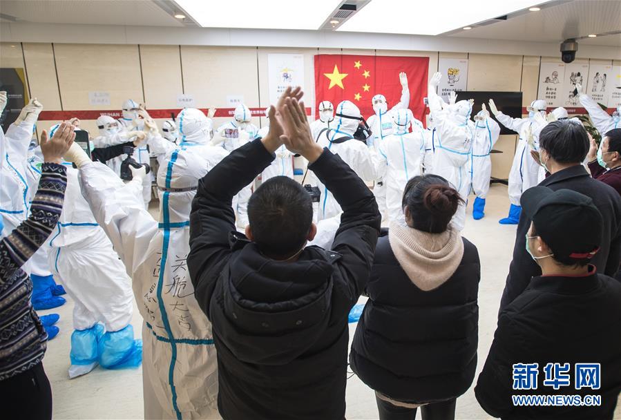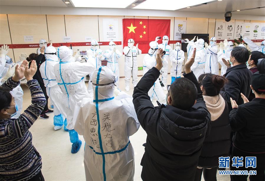 3月10日,医护人员与治愈患者一起唱歌庆祝休舱。当日,武汉武昌方舱医院正式休舱。来自湖南、广西等地医疗队的医护人员在出舱前用歌声送别痊愈患者。新华社记者肖艺九摄