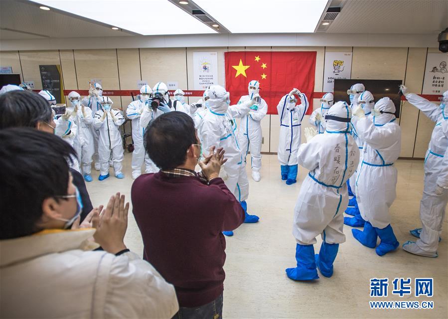3月10日,医护人员一起唱歌庆祝休舱。当日,武汉武昌方舱医院正式休舱。来自湖南、广西等地医疗队的医护人员在出舱前用歌声送别痊愈患者。新华社记者肖艺九摄