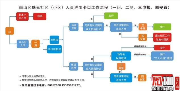 社区对所有疫情重点地区返深人员实行“一摸、二联、三等、四办”互动模式,一是加强社区与物管处的互动,了解小区计划从重点疫区返深人员信息,摸清底数;二是所有人员均提前联系,返深人数、时间、健康状况等信息均做到心中有数;三是提前在卡口等待,24小时服务,一旦到达卡口立即登记、测体温,送至集中隔离健康驿站;四是提前办好入住手续,避免居民等待时间过长。
