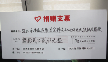 为了对梓盛发集团全体员工的爱心善款表示感谢,3月11日上午,福田区民政局在区慈善会举办了一场简单却不失温暖的捐赠仪式。在区民政局副局长吕凡、沙头街道办副调研员潘伟斌、梓盛发集团副总裁唐庆华的见证下,邓大将总经理将82.2万元的捐赠支票交付到区慈善会会长庄儒平的手中。庄儒平会长表示:“疫情发生后,武汉人民将自己与病毒封在一隅顽强斗争,他们‘牺牲小我,成就大我’的精神让人感动。希望这笔善款能为武汉抗疫一线奉献绵薄之力!”