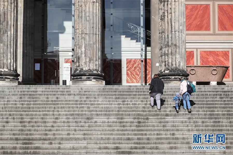 3月16日,在德国柏林,行人走上闭门的柏林老博物馆前的台阶。德国疾控机构罗伯特·科赫研究所公布的最新数据显示,截至15日15时,德国累计新冠肺炎确诊病例升至4838例,较前一日增加1043例,死亡病例升至12例。新华社记者单宇琦摄