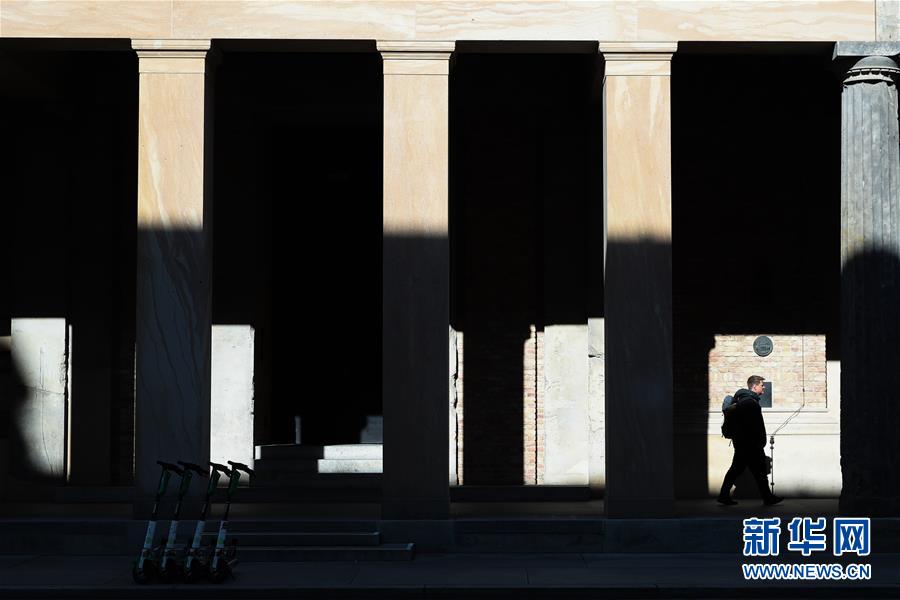 3月16日,在德国柏林,行人走过关闭的柏林新博物馆旁的廊柱。德国疾控机构罗伯特·科赫研究所公布的最新数据显示,截至15日15时,德国累计新冠肺炎确诊病例升至4838例,较前一日增加1043例,死亡病例升至12例。新华社记者单宇琦摄