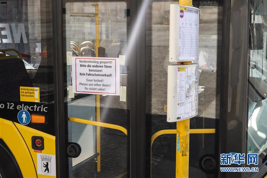 3月16日,在德国柏林,一辆公交车上张贴着禁止乘客从前门上车避免与司机接触的告示。德国疾控机构罗伯特·科赫研究所公布的最新数据显示,截至15日15时,德国累计新冠肺炎确诊病例升至4838例,较前一日增加1043例,死亡病例升至12例。新华社记者单宇琦摄
