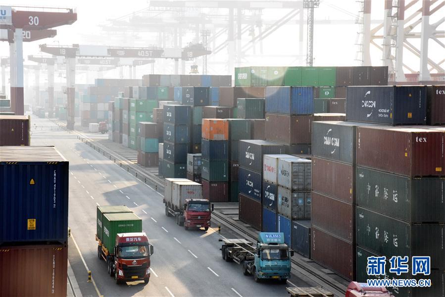 3月17日,卡车在青岛港集装箱三期码头运送集装箱。近日,山东港口集团各港区相关企业已全面恢复生产,船舶抵离港班次、集装箱吞吐量等均逐步回升,港口生产有序推进、积极向好。新华社记者李紫恒摄