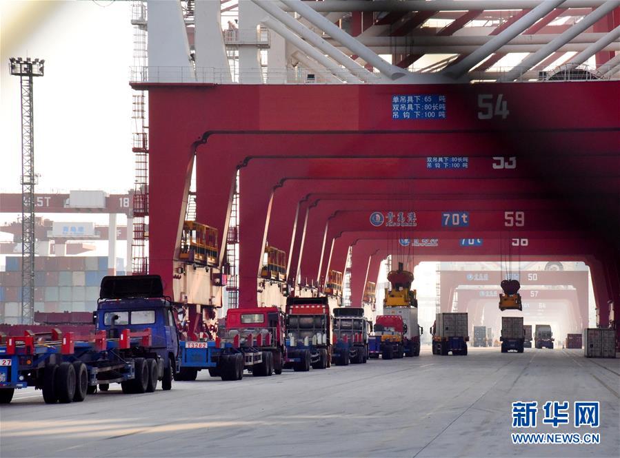3月17日,卡车在青岛港集装箱三期码头排队准备装运集装箱。近日,山东港口集团各港区相关企业已全面恢复生产,船舶抵离港班次、集装箱吞吐量等均逐步回升,港口生产有序推进、积极向好。新华社记者李紫恒摄