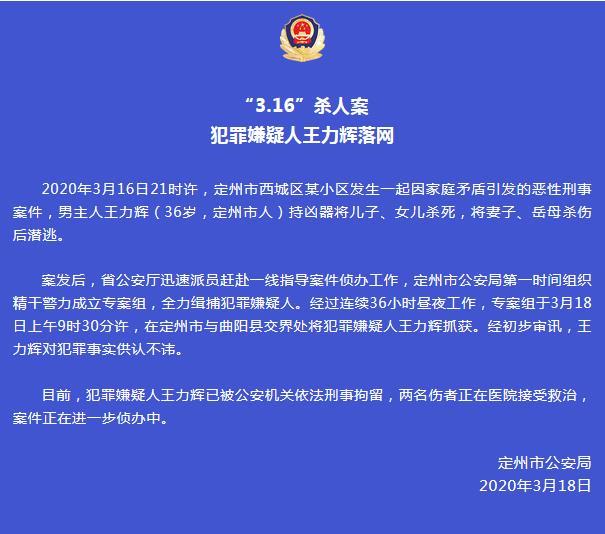 通报称,案发后,河北省公安厅迅速派员赶赴一线指导案件侦办工作,定州市公安局第一时间组织精干警力成立专案组,全力缉捕犯罪嫌疑人。经过连续36小时昼夜工作,专案组于3月18日上午9时30分许,在定州市与曲阳县交界处将犯罪嫌疑人王力辉抓获。经初步审讯,王力辉对犯罪事实供认不讳。
