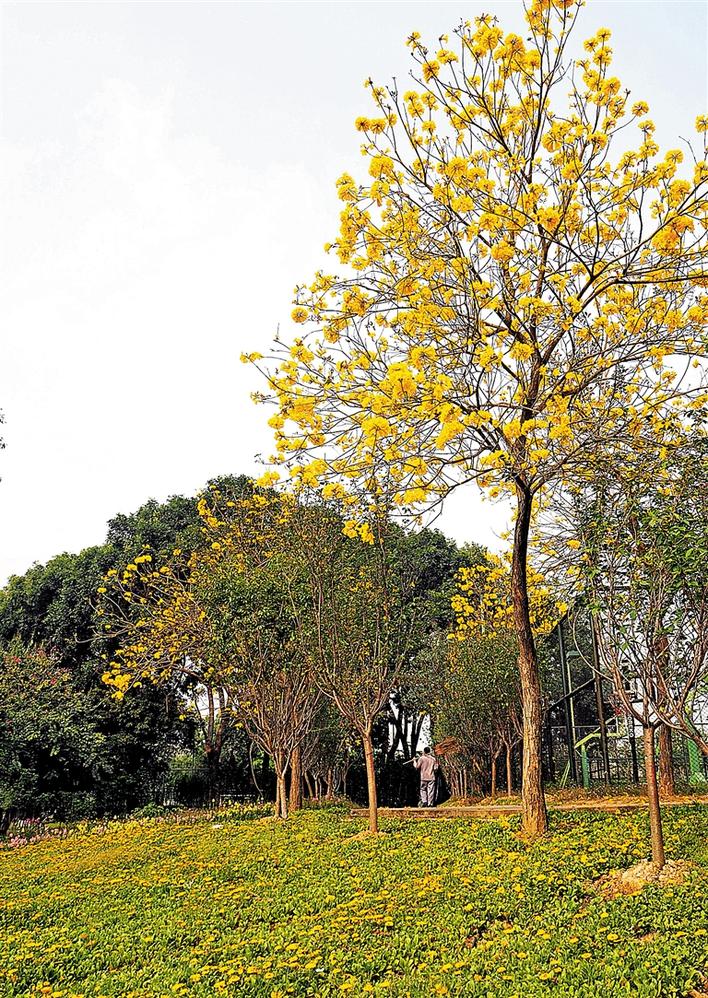 观澜湖大地生态园内繁花似锦,黄色的黄花风铃木肆意绽放,春意盎然。