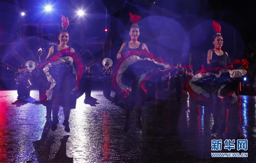 这是演员在爱丁堡国际军乐节上冒雨表演的资料照片(2019年8月6日摄)。新华社记者韩岩摄