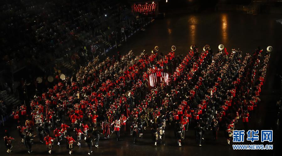 这是军乐队在爱丁堡国际军乐节上冒雨表演的资料照片(2019年8月6日摄)。新华社记者韩岩摄