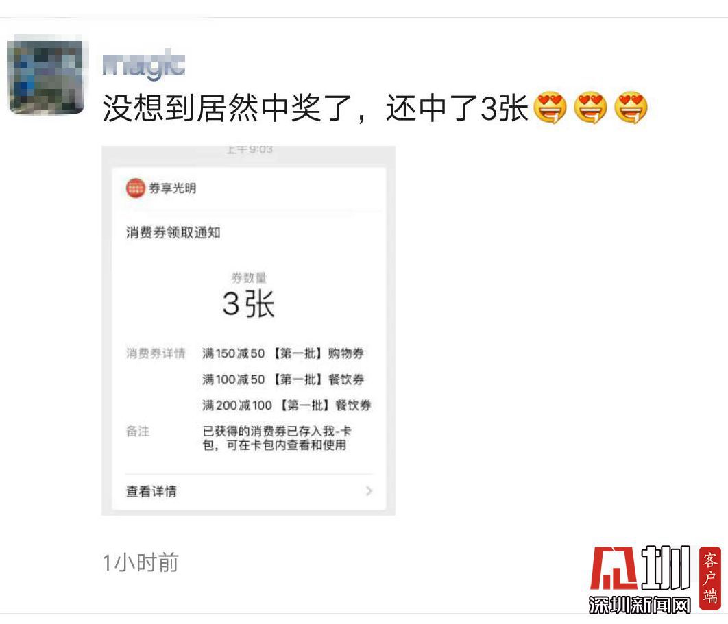 深圳新闻网2020年4月10日讯(见圳客户端、深圳新闻网记者 王琪)4月10日上午,光明区第一批价值1000万元的电子消费券发放完成。据区工业和信息化局相关工作人员介绍,约有65000人领到首批光明电子消费券。“消费券使用方便吗?”“哪些地方可以使用消费券?”……相关的问题成为这一周以来市民关注的热点话题。记者于4月7日登录微信小程序“券享光明”参与了消费券预约,4月10日线下实地体验如何使用电子消费券。