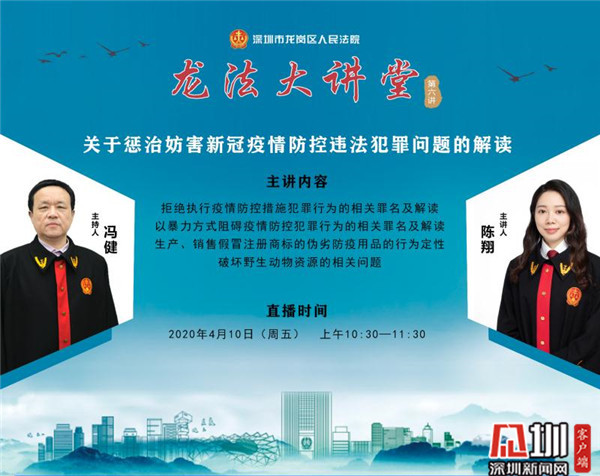 见圳客户端·深圳新闻网4月10日讯(见圳客户端、深圳新闻网记者 李云云 通讯员 张建国)4月10日上午,龙岗法院“龙法大讲堂”上线第六讲,再次以直播方式,就妨害疫情防控违法犯罪问题向观众进行详细解读。