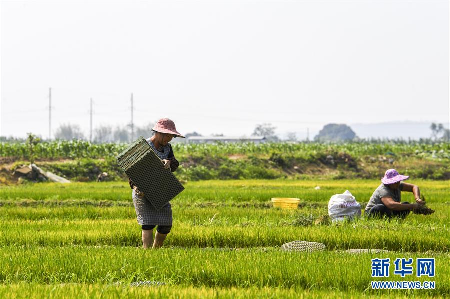 4月15日,百色市田阳区那坡镇农民在水稻育秧田里劳作。随着气温回升,广西百色市右江河谷一带农民抓紧农时,做好春耕春播,田间一派繁忙景象。新华社记者曹祎铭摄