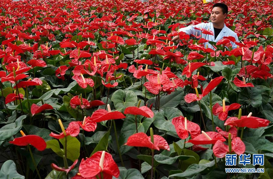 4月15日,工作人员在河南省洛阳市伊川县江左镇一处智能温室内查看红掌的生长情况。新华社记者李安摄