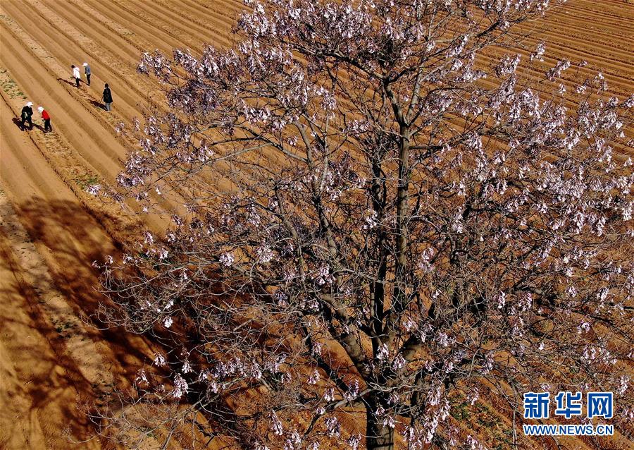 农户在洛阳市洛宁县小界乡一处农田里劳作(4月13日摄,无人机照片)。新华社记者李安摄