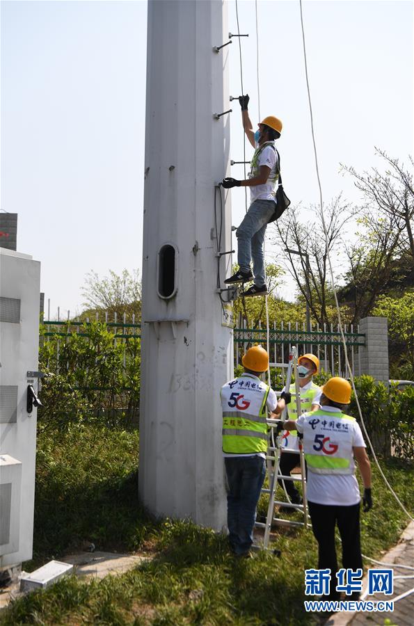 4月15日,工作人员在位于重庆高新区高新大道的5G基站建设现场作业。新华社记者王全超摄