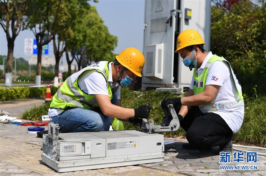 4月15日,工作人员在位于重庆高新区高新大道的5G基站建设现场作业。新华社记者王全超摄