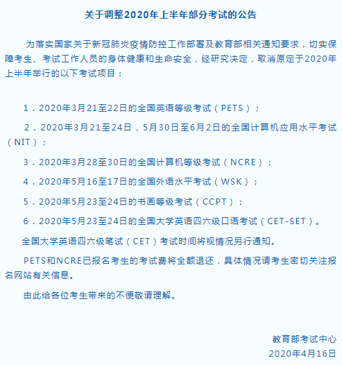 关于调整2020年上半年部分考试的公告