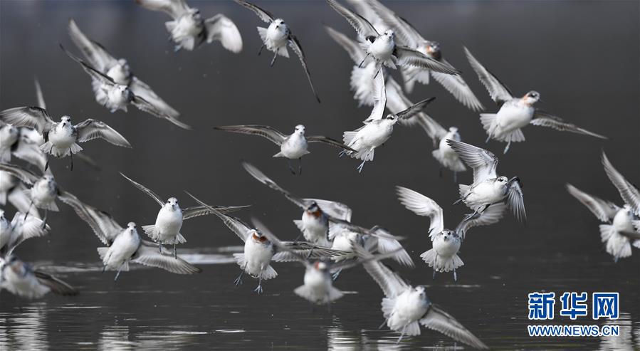 4月16日,在海南东寨港国家级自然保护区,红颈瓣蹼鹬在水面上飞翔。新华社记者杨冠宇摄