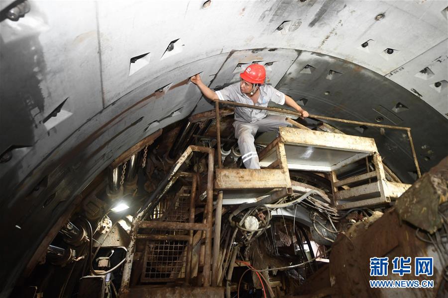 4月16日,施工人员在杭州地铁1号线三期工程项目现场查看盾构管片螺栓安装情况。新华社记者 黄宗治 摄