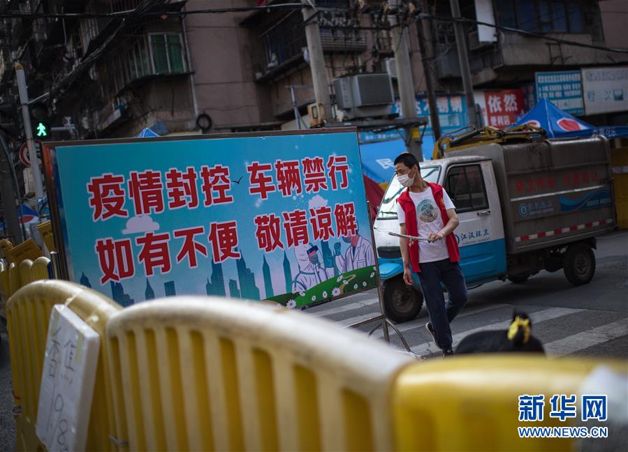 4月16日,在武汉江汉区民主一街一处卡口,工作人员为环卫车辆放行。随着武汉疫情防控形势好转,店铺陆续开业,人们逐步复工复产,城市活力逐渐恢复。新华社记者肖艺九摄