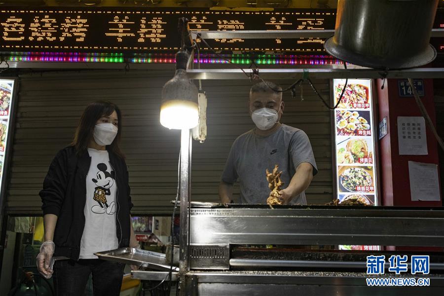 4月16日,烧烤店老板在制作烧烤。随着武汉疫情防控形势好转,店铺陆续开业,人们逐步复工复产,城市活力逐渐恢复。新华社记者沈伯韩摄