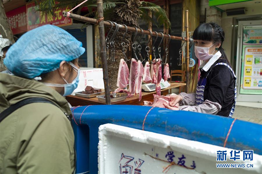 4月16日,市民在武汉街头购买鲜肉。随着武汉疫情防控形势好转,店铺陆续开业,人们逐步复工复产,城市活力逐渐恢复。新华社记者沈伯韩摄