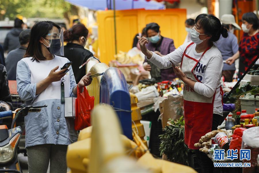 4月16日,人们在武汉街边购买新鲜蔬菜、调料等。随着武汉疫情防控形势好转,店铺陆续开业,人们逐步复工复产,城市活力逐渐恢复。新华社记者沈伯韩摄