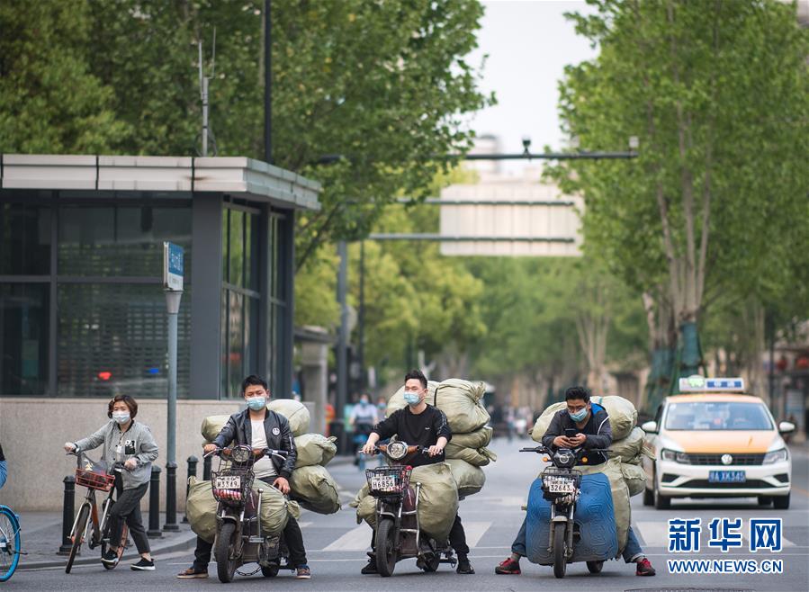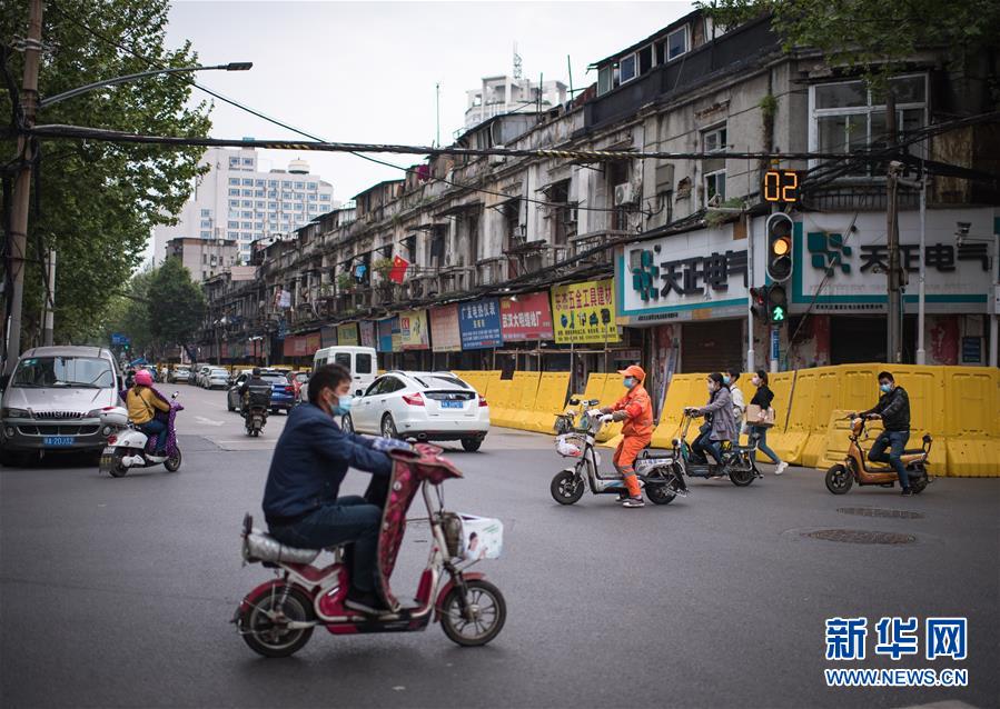 4月16日,市民在江汉区前进一路出行。随着武汉疫情防控形势好转,店铺陆续开业,人们逐步复工复产,城市活力逐渐恢复。新华社记者肖艺九摄