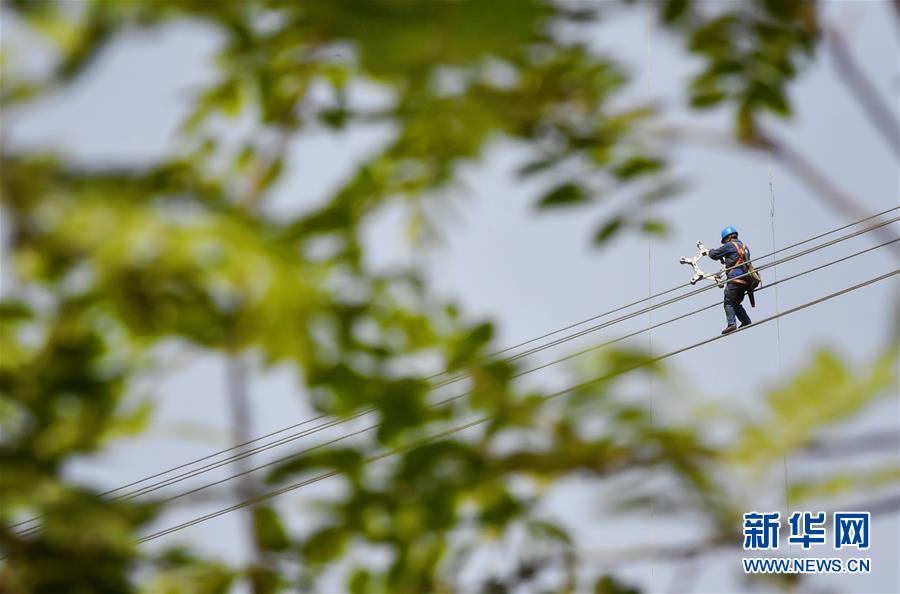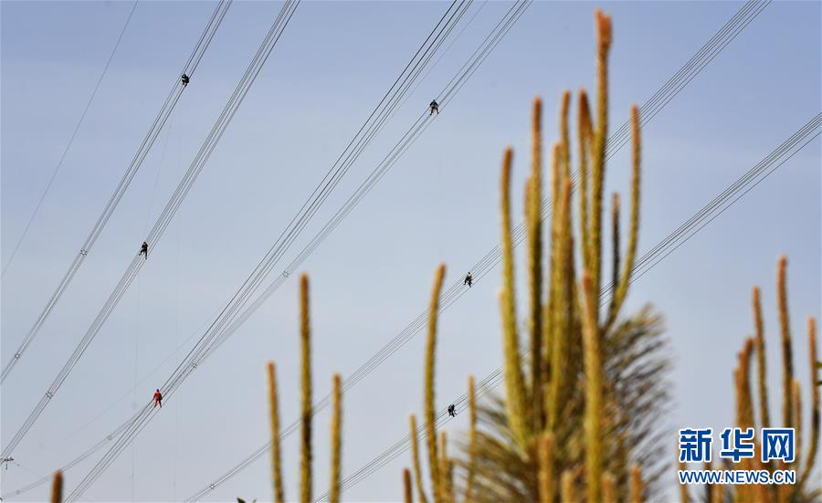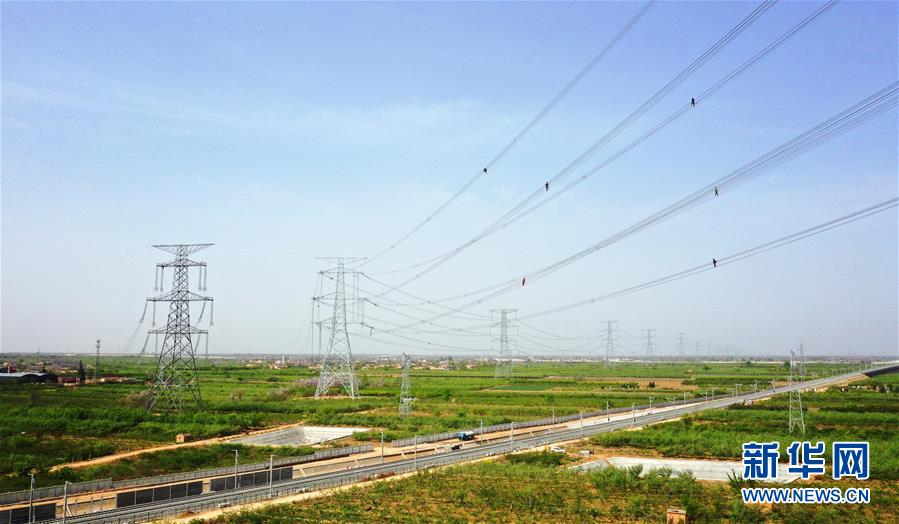 4月16日,陕西送变电公司的工作人员在位于陕西省咸阳市礼泉县的750千伏乾泾电力线路迁改现场进行高空作业。日前,国网陕西电力750千伏乾泾Ⅰ、Ⅱ线46至50号区段电力线路迁改工程有序推进。银西高铁建设过程中,在陕西省礼泉县西皋村北侧出现一处高铁、公路桥和超高压电力线路的结构冲突,为保障银西高铁顺利建设,国网陕西电力公司对750千伏乾泾电力线路实施迁改。新华社记者刘潇摄