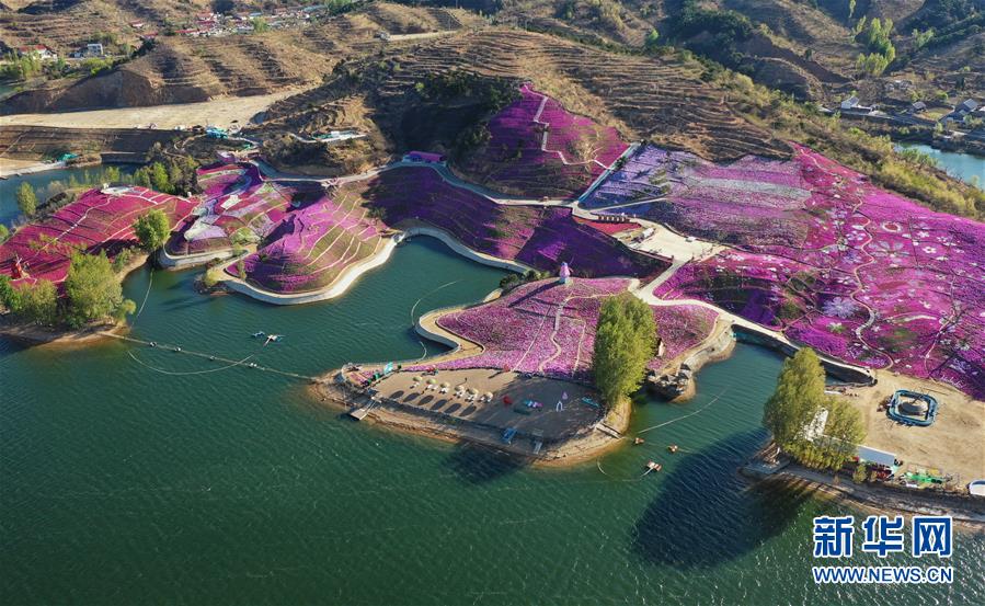 4月21日拍摄的迁西县大黑汀水库东岸的芝樱花(无人机照片)。近日,河北省迁西县大黑汀水库东岸的芝樱花竞相开放,美不胜收。新华社记者杨世尧摄