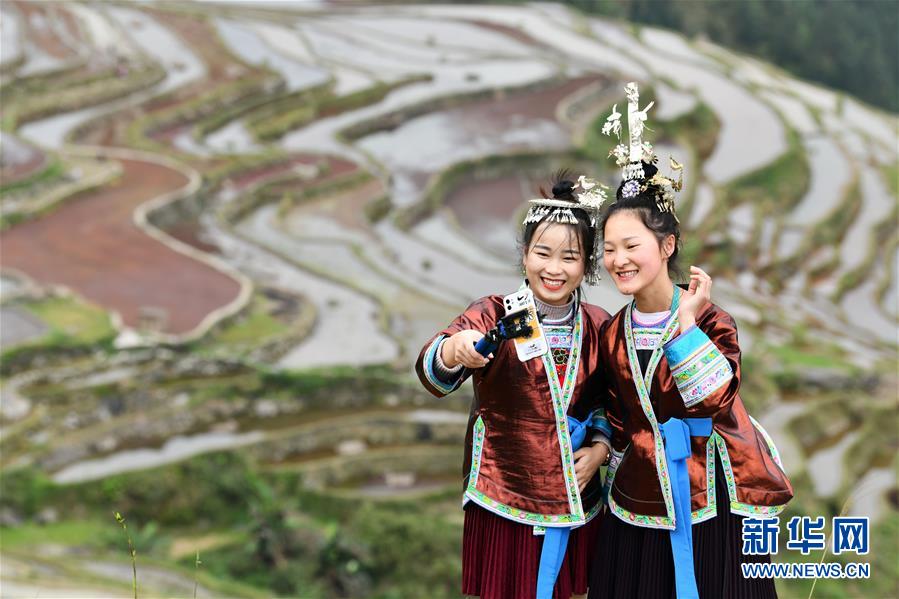 吴贤艳(左)与村里的大一女生梁琼英在直播推介加榜梯田风光(4月19日摄)。新华社记者杨文斌摄