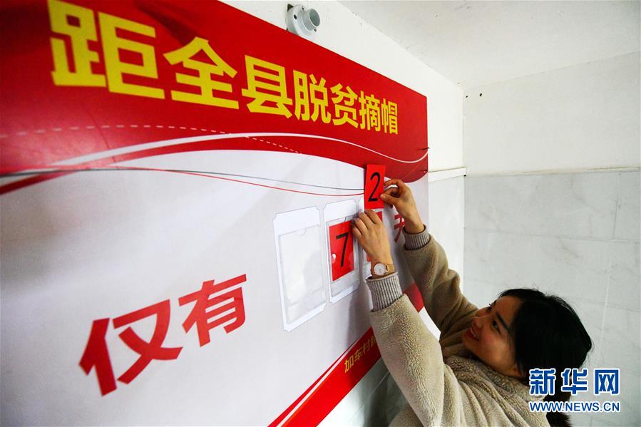 在加榜乡加车村脱贫攻坚指挥所,吴贤艳在更换全县脱贫摘帽倒计时信息牌(4月19日摄)。新华社记者杨文斌摄