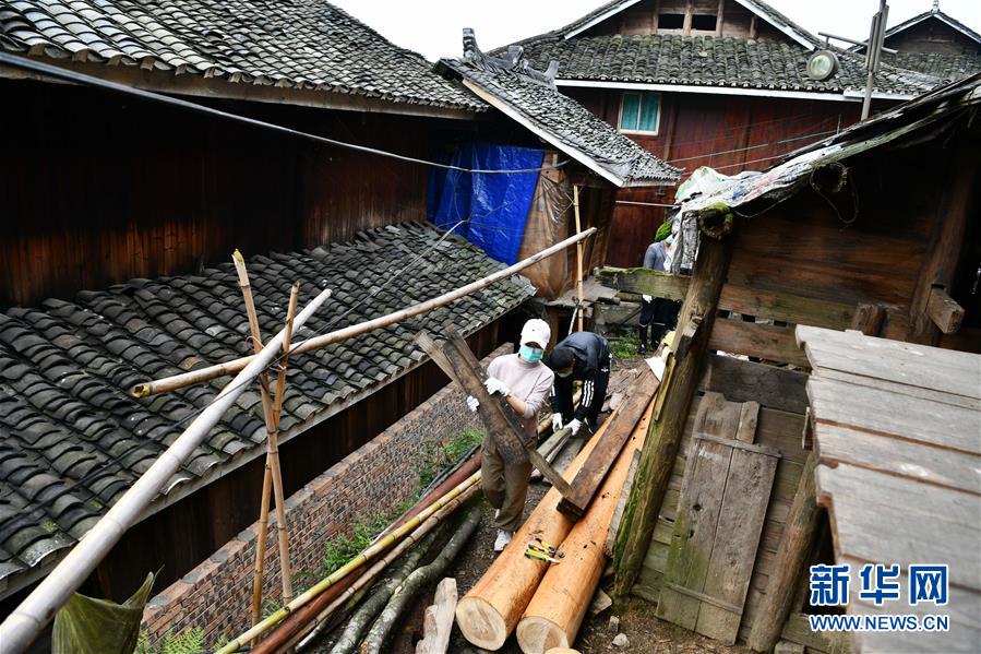 吴贤艳(前)与帮扶干部们在帮助村民清理人居环境整治的建筑材料(4月19日摄)。新华社记者杨文斌摄