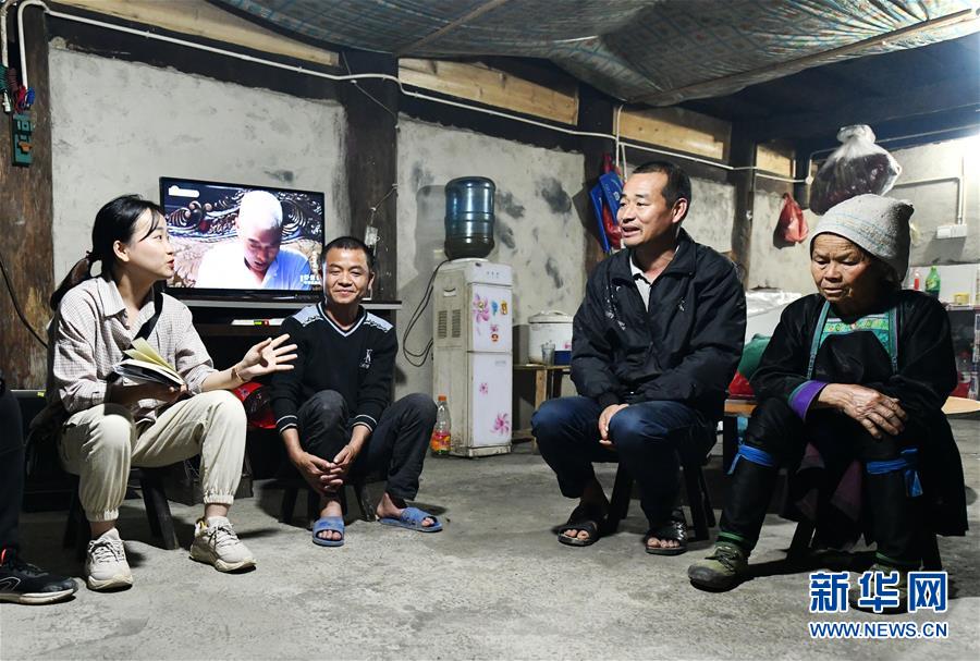 在加榜乡加车村脱贫攻坚指挥所,吴贤艳(右)与帮扶干部在讨论脱贫攻坚上报材料填写情况(4月18日摄)。新华社记者杨文斌摄
