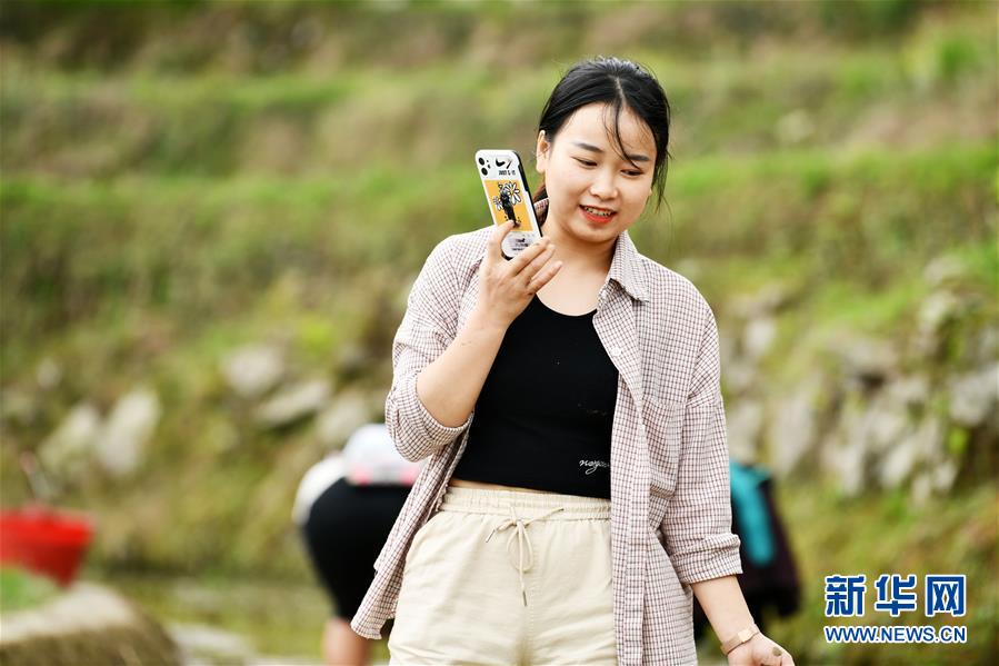 吴贤艳在帮助村民插小秧时接听帮扶户电话咨询(4月18日摄)。新华社记者杨文斌摄