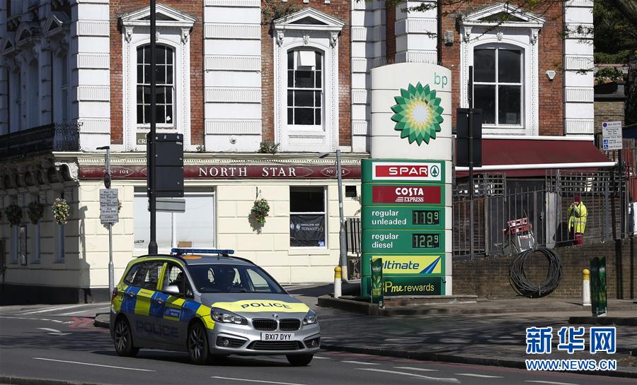 4月21日,一辆警车驶过英国伦敦的一家加油站。新华社记者韩岩摄