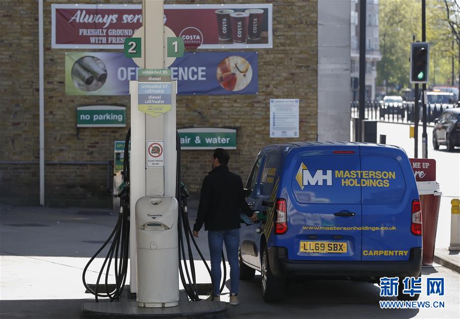 4月21日,一名男子在英国伦敦的一个加油站给车辆加油。新华社记者韩岩摄