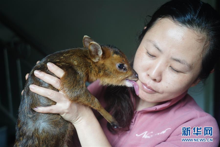 4月21日,被官山国家级自然保护区东河保护管理站救助的小麂在舔舐工作人员的脸。大约半个月前,位于江西省宜丰县的官山国家级自然保护区东河保护管理站的工作人员救助了一位“特殊客人”——一头幼年小麂。在保护站工作人员的精心照料下,小麂已经将这里当成了自己的家。工作人员表示,将在小麂具备独立生存能力后将它放归自然。新华社记者周密摄