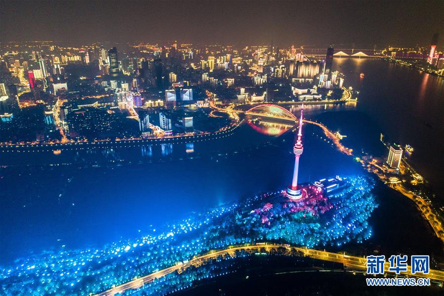 这是4月7日晚在武汉龟山拍摄的夜景(无人机照片)。新华社记者肖艺九摄