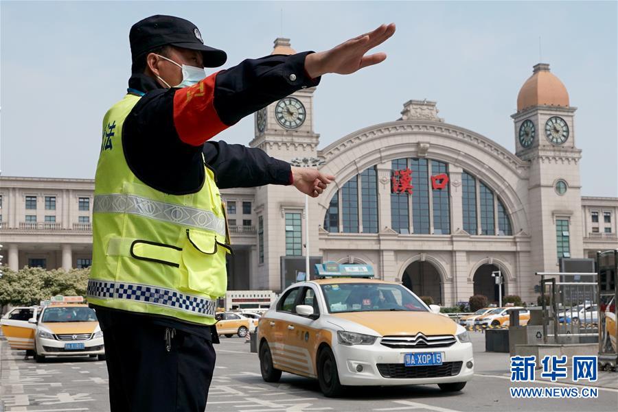 4月8日,管理人员在汉口火车站前指挥出租汽车入位。新华社记者王毓国摄