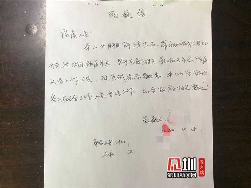 经过调查,该小车及司乘人员为疫区返深人员,黄幼专及派出所工作人员上门进行了解,经过沟通交流,向其解释现阶段防疫点工作要求,希望双方互相理解。该人员认识到自己的错误,于日前回到阳和浪卡点向工作人员当面道歉,并写下书面检讨书。