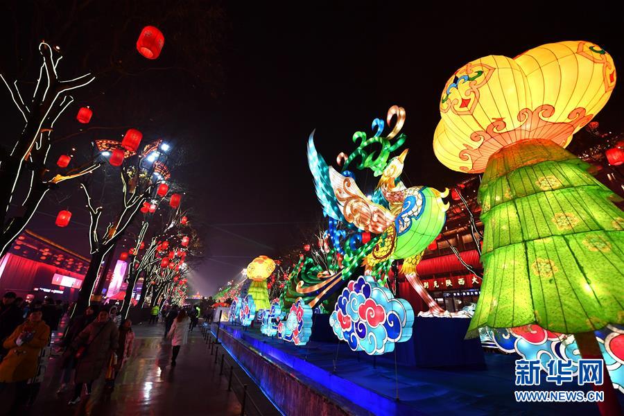 1月17日,游客在西安大唐不夜城步行街欣赏彩灯。大唐不夜城步行街位于西安市大雁塔脚下,近年来,步行街突出历史文化特色,以唐代元素为主线,创新打造文化浓厚的现代时尚街区,已成为西安旅游新地标。新华社记者张博文摄