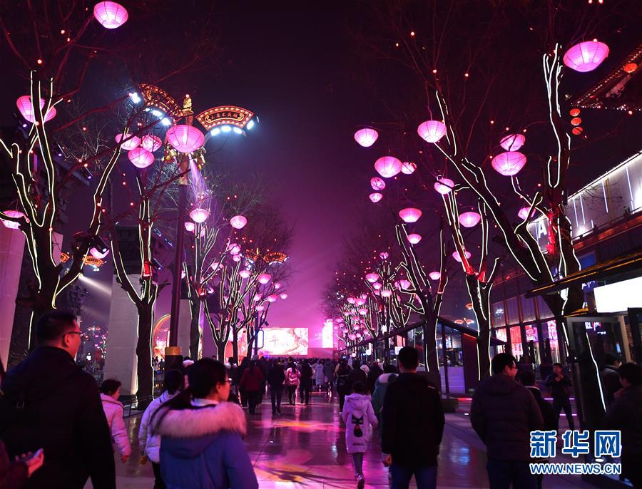 1月17日,游客在西安大唐不夜城步行街欣赏彩灯。大唐不夜城步行街位于西安市大雁塔脚下,近年来,步行街突出历史文化特色,以唐代元素为主线,创新打造文化浓厚的现代时尚街区,已成为西安旅游新地标。新华社记者张博文摄