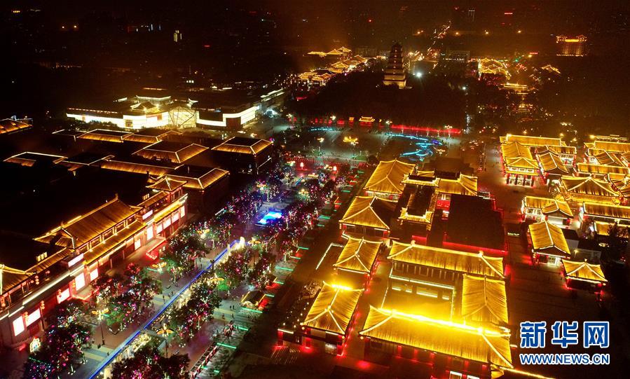 西安大唐不夜城夜景(2019年8月8日无人机照片)。大唐不夜城步行街位于西安市大雁塔脚下,近年来,步行街突出历史文化特色,以唐代元素为主线,创新打造文化浓厚的现代时尚街区,已成为西安旅游新地标。新华社记者刘潇摄