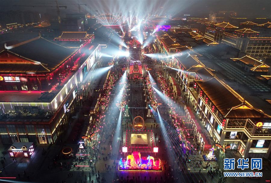西安大唐不夜城夜景(2019年2月17日无人机照片)。大唐不夜城步行街位于西安市大雁塔脚下,近年来,步行街突出历史文化特色,以唐代元素为主线,创新打造文化浓厚的现代时尚街区,已成为西安旅游新地标。新华社记者邵瑞摄