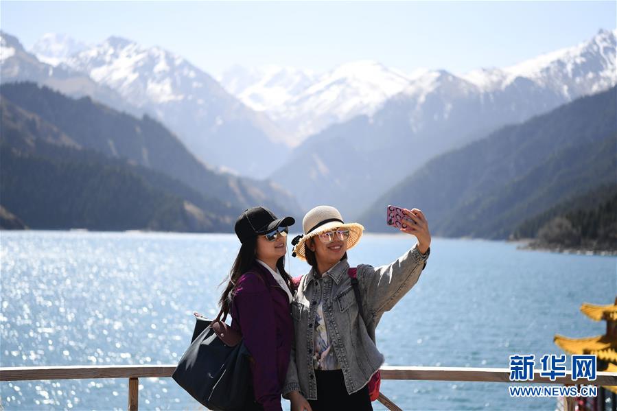 4月25日,游客在新疆天山天池景区自拍。当日,新疆天山天池景区启动首届“开湖节”,景区在严格做好疫情防控的前提下,积极推动旅游业复工复产。新华社记者沙达提摄