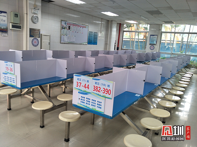 在教室上课时,学生需按照单人单桌就坐,为保持距离,每间教室控制在40人以内。学校落实分班排队前往食堂就餐,食堂餐桌设置挡板,学生按照座位号对角线入座用餐。“为迎接初三学生返校,我们将学校的三个食堂充分利用起来,并细心做好防控措施。”陈主任说。特殊时期,学校还劝导近处的学生尽量走读,实在是家里远的才安排住宿。目前,仅有16名学生登记了住校需求,学校将安排单人单间住宿。