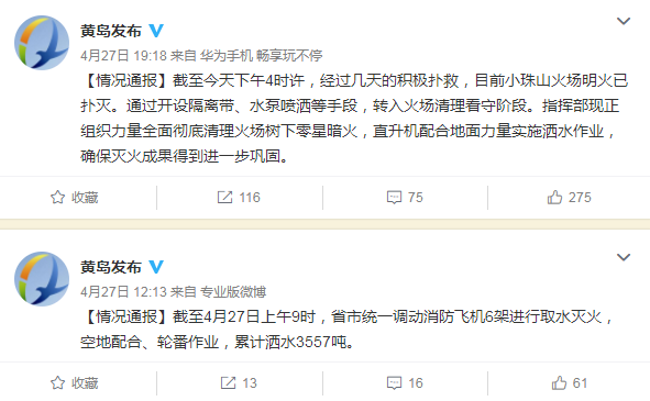 中共青岛市黄岛区委员会宣传部官方微博今日中午12时13分曾发布消息称,截至4月27日上午9时,省市统一调动消防飞机6架进行取水灭火,空地配合、轮番作业,累计洒水3557吨。(完) (记者杨兵 胡耀杰)