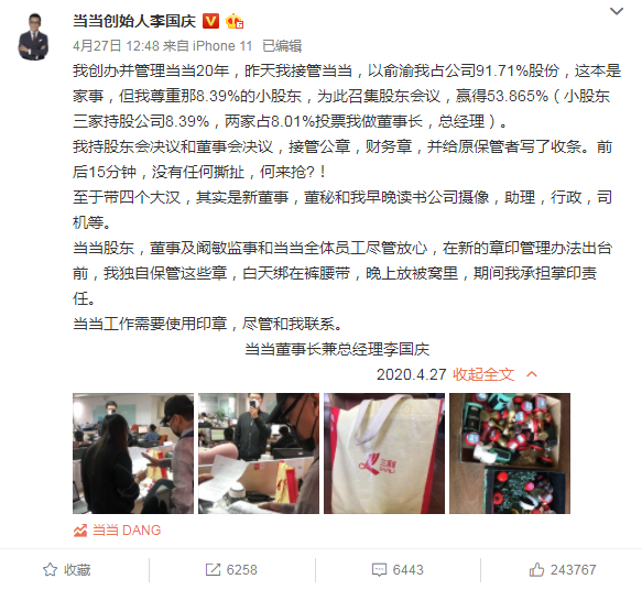 而为什么李国庆能那么从容地拿走公章呢?当当副总裁阚敏表示,李国庆毕竟过去是公司的老板,员工对他还是稍稍有点顾虑。4月26日下午,当当网方面表示,2020年4月26日早上9时34分,“李国庆伙同5人,闯入当当网办公区,抢走几十枚公章、财务章,公司已经报警。”目前,俞渝对此事件还并未发表公开回应。