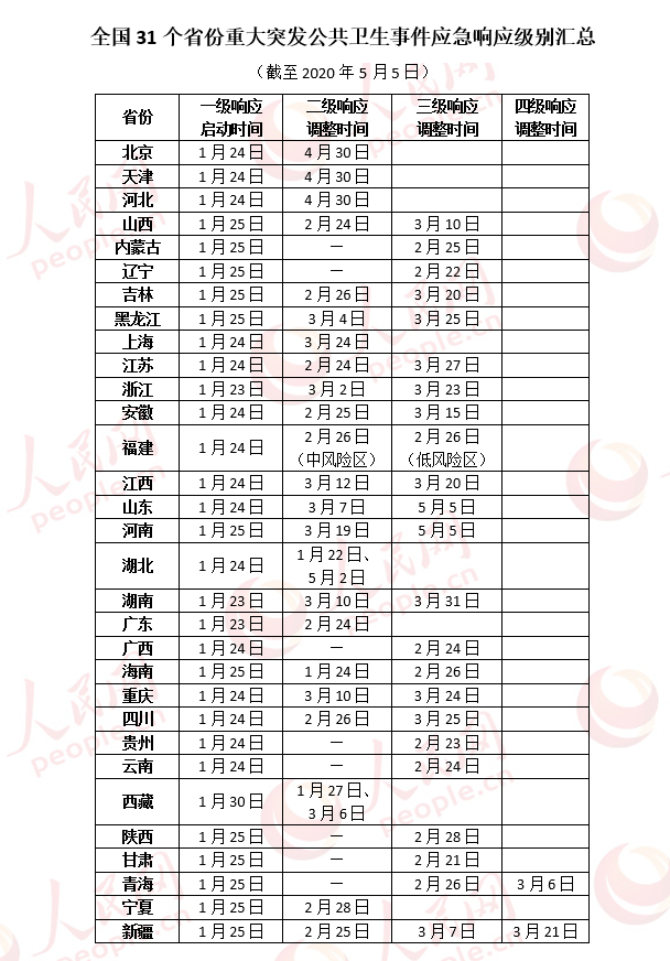 截至5月5日,二级响应级别的8个省份为:北京、天津、河北、上海、湖北、广东、西藏、宁夏。其中,西藏部分地区按三级响应管理。